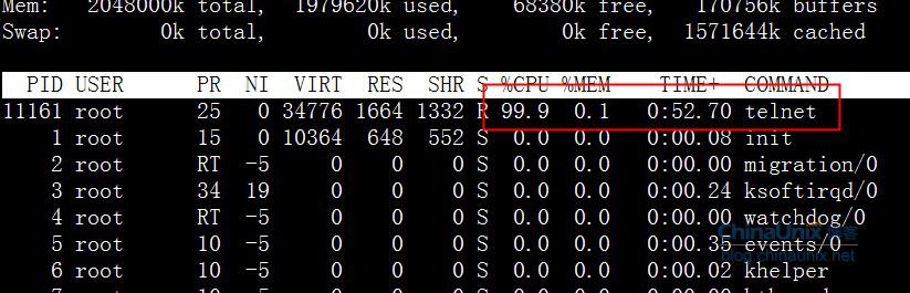 这个时候top可以看到telnet经常耗CPU 100%。
