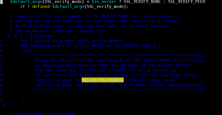 不过现在跑个脚本多会跑出一端报警,LWP Agent里面好像又没有参数可以传进去设置这个,而且以前的很多脚本还地改,然后我就直接把这段警告消息给注释了。实在不想折腾这个老东西。/usr/lib/perl5/site_perl/5.8.5/IO/Socket/SSL.pm