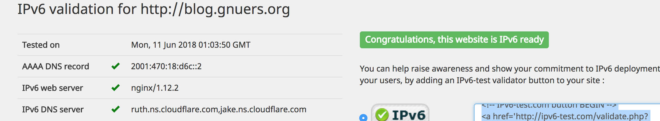 基本方案周末有时间,把blog重新整理了一下,目前支持native IPV6 only环境访问。相关的方案1. DNS服务器迁移到cloudflare。原本是准备自己再弄个VM,部署IPV6的DNS。后来觉得太费钱,直接用了cloudflare。2. V6地址是通过He.net的隧道接入。