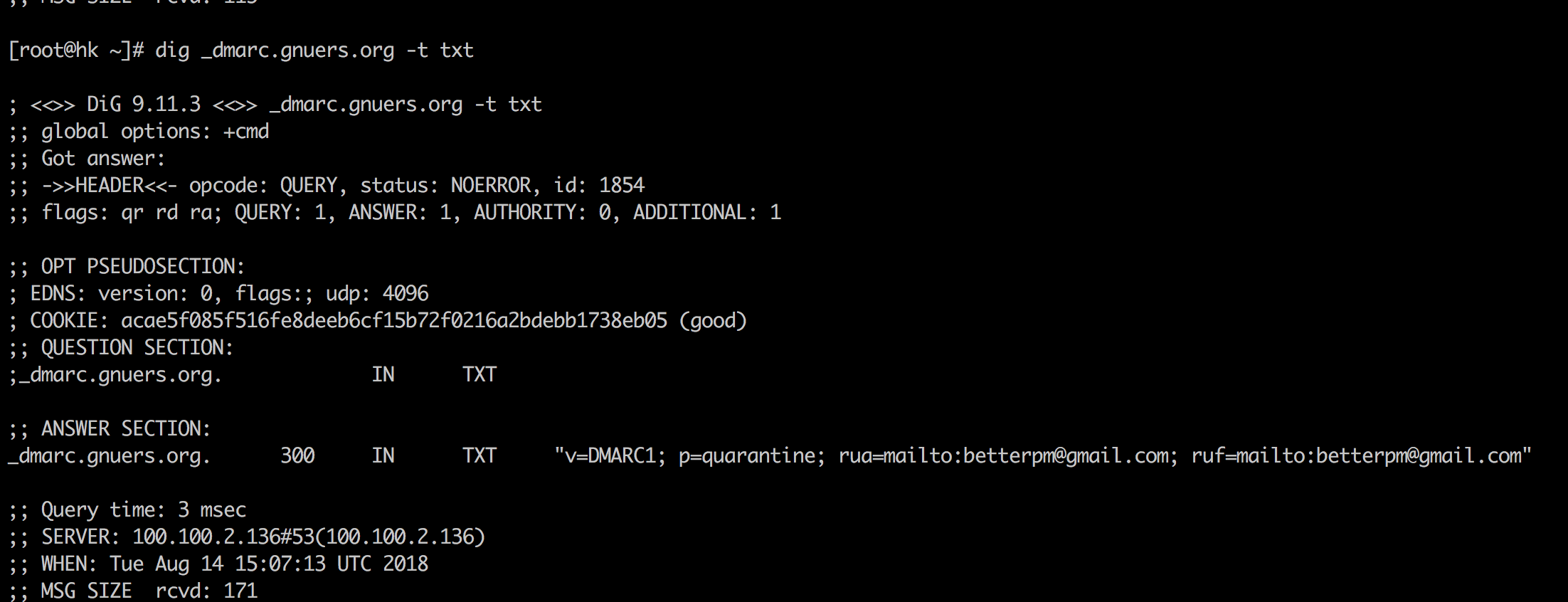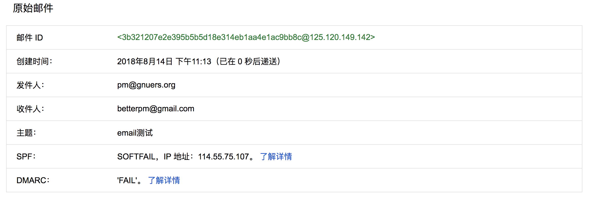 当配置了dmarc记录后,各邮件服务器会加强对邮件源的检查从邮件头,可以看到gmail有对dmarc记录做校验。