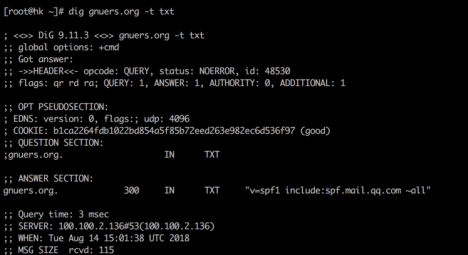 通常我们为了防止自己域名邮箱被伪造,会通过配置SPF记录来限制域名邮箱可以外发的IP网段。SPF相关配置说明可以参考:https://support.google.com/a/answer/33786?hl=zh-Hans例如我个人的邮箱是托管在QQ企业邮箱,因此就设置了相关的SPF记录