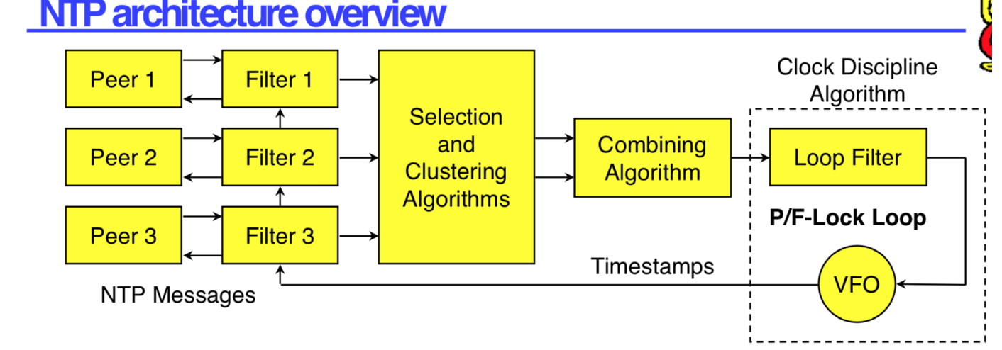 从上面的4个图可以看到,实际上NTPD的同步稳定性相对比较好一些。NTP协议本身精度的瓶颈是在于网络延迟稳定性,NTPD在这一块有大量的算法保证:1. Clock Filter Algorithm (huff-n’-puff filter)2. Clock Select Algorithm3. Clock Cluster Algorithm:4. Clock Discipline Algorithm:整体的流程如下