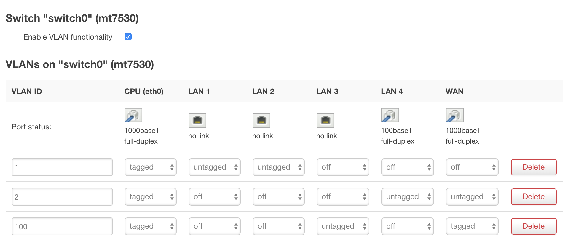 openwrt路由器上简单设置一下软交换,把对应的vlan和一个lan口桥接在一起,lan口选择untag。