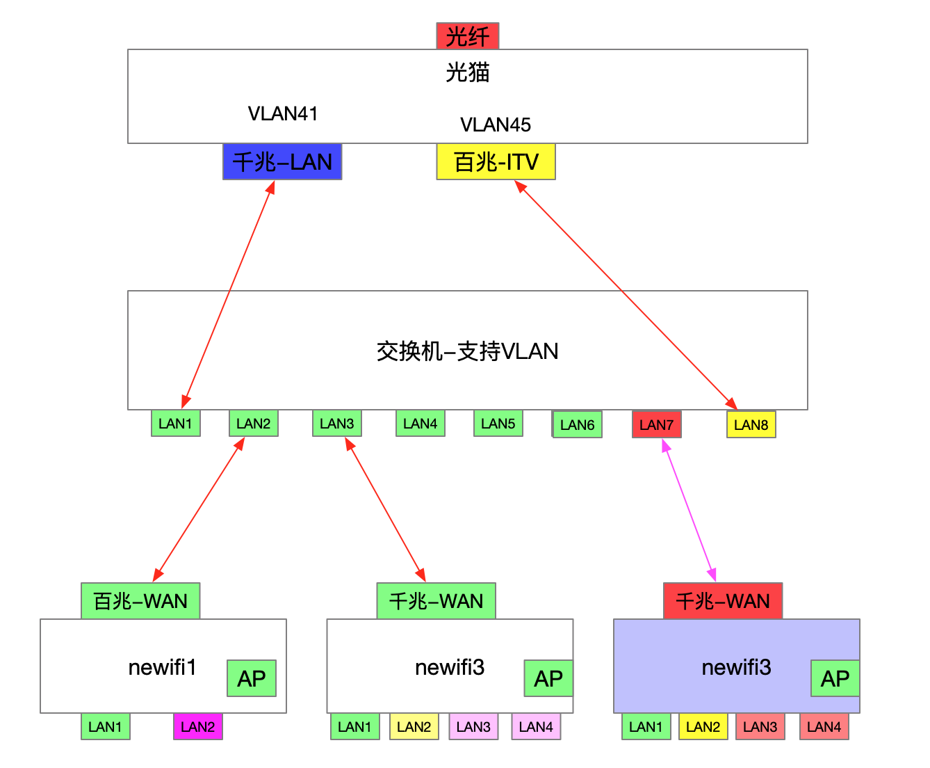 由于老房子弱电箱到客厅电视后面只有一根网线,所以我也遇到许多人都有的单线复用场景。之前是直接网上买了2个转接头,把8芯网线拆成2个4芯网线来使用。不过问题就是局域网内只有100M的带宽。双11看电信搞活动,花了之前100M宽带一半的钱把家里的宽带升级到了200M。就想着通过vlan隔离来把单线复用配置一下。